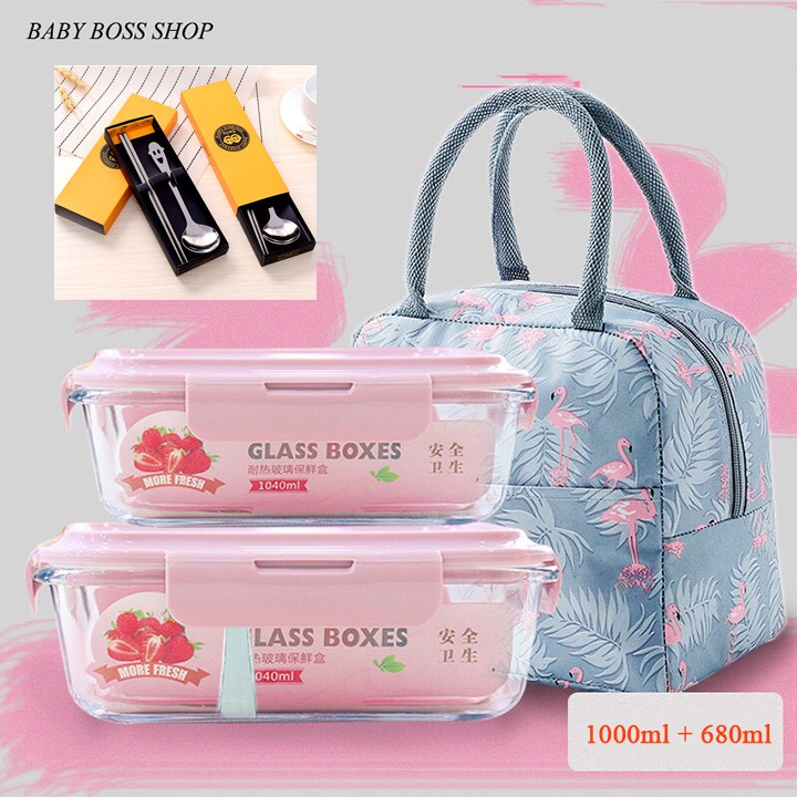 Hộp cơm thủy tinh chia ngăn Hộp cơm văn phòng tặng túi giữ nhiệt và thìa đũa